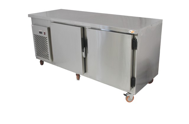 O refrigerador industrial horizontal padrio da Local Service é dotado de duas ou três portas, possui corpo tipo monobloco, constituido de tampo superior, paredes externas visiveis, portas, fundo e cabine para compressor em aço inoxidável. Seu revestimento interno é em chapa de aluminio liso.